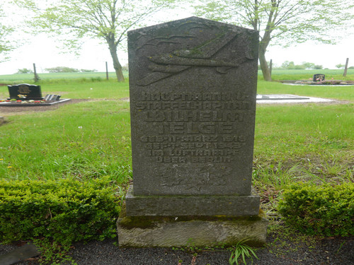 Das Grab ist durch einen länglichen Stein gekennzeichnet, auf dem ein Kriegsflugzeug zu sehen ist.