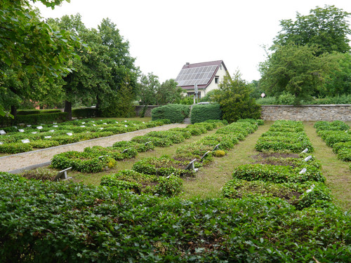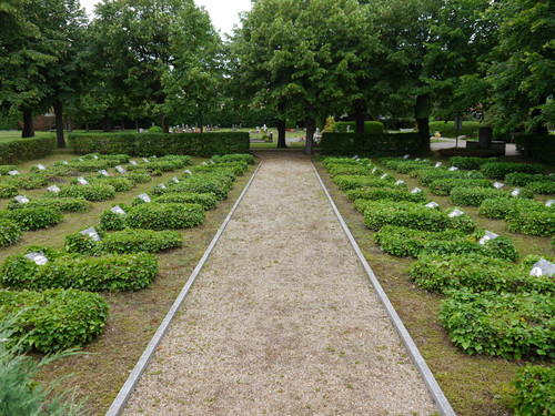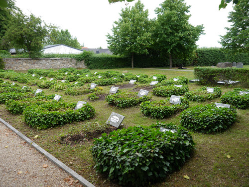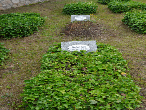 Auf den efeubewachsenen Einzelgräbern befinden sich kleine Steintafeln mit ovalen Schildern aus Emaille, die die Namen und Lebensdaten der hier Bestatteten mitteilen.