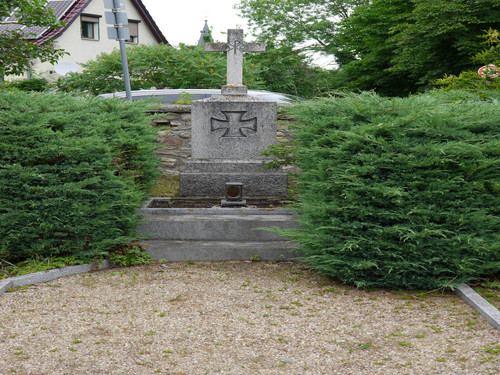 Ein Weg teilt die Anlage. An dessen Ende befindet sich ein Grabdenkmal aus Granit, auf dessen Spitze sich ein Kreuz befindet.