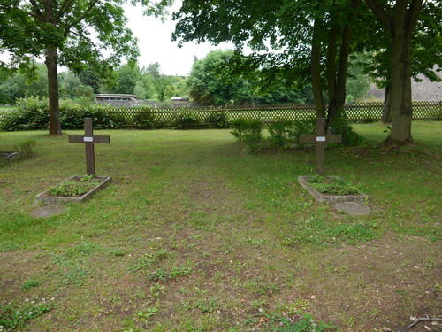 Die Gräber sind durch einen Grabstein bzw. Holzkreuze gekennzeichnet.